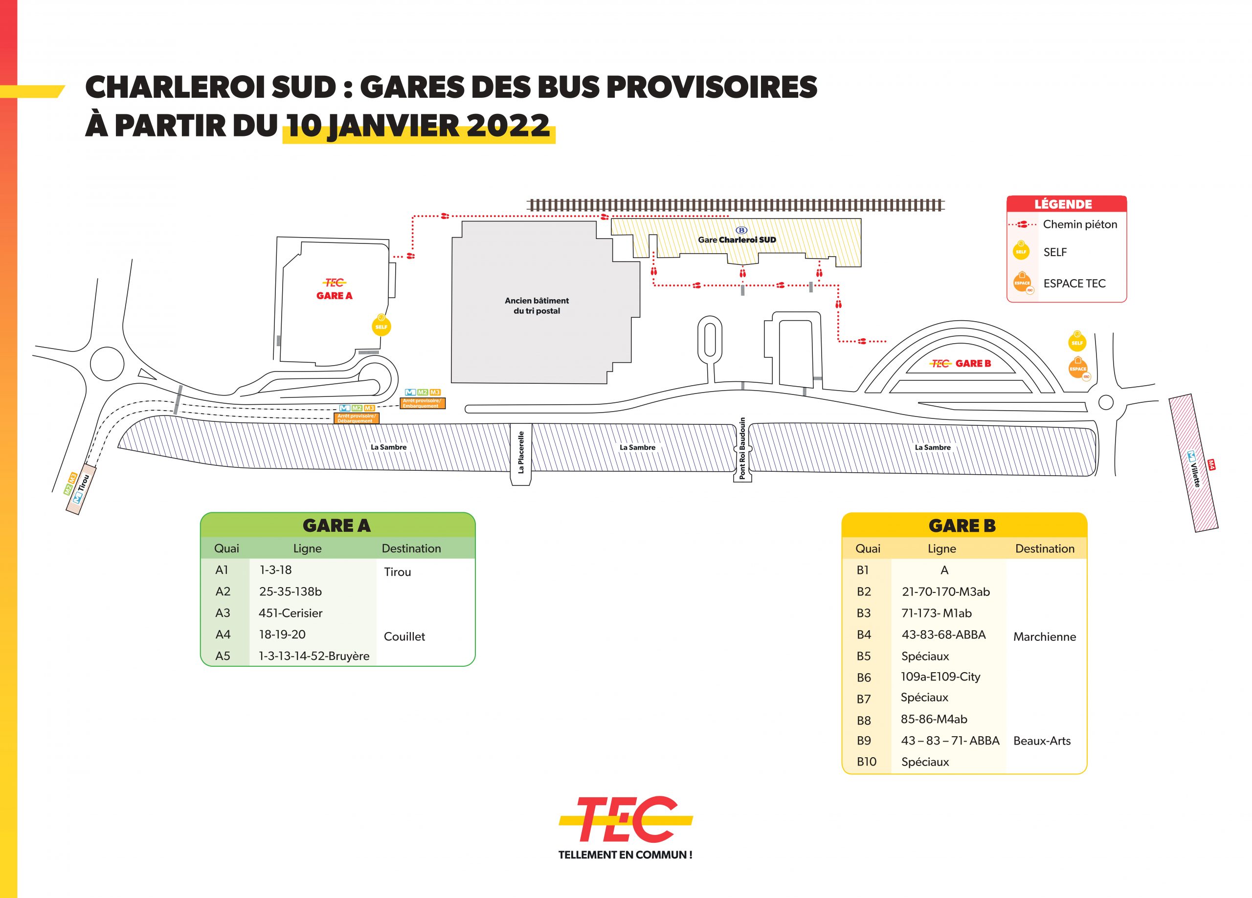 Dans le cadre de l’aménagement des quais du bord de Sambre, la Ville de Charleroi, le Port autonome de Charleroi et le TEC ont entrepris des travaux à la gare du Sud depuis le mois de juillet 2021. En raison de l’avancement de ceux-ci, la gare des bus de Charleroi Sud sera scindée en deux gares provisoires à partir du 10 janvier 2022.