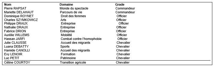 Avec cette récompense, Luc Petit est élevé au grade de Chevalier du Mérite wallon. Mais il n’est pas le seul récompensé ce samedi. Le chanteur Pierre Rapsat est par exemple élevé, à titre posthume, au rang de Commandeur. La liste complète des récompenses est à retrouver ci-dessous.