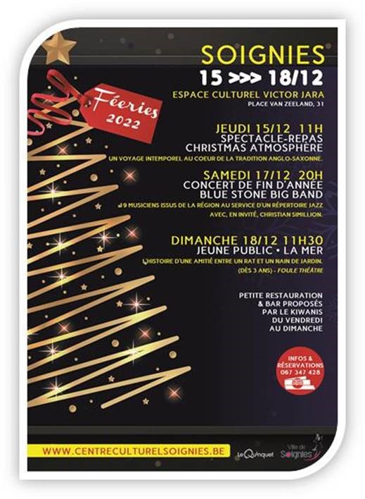 Du 15 au 18 décembre, à l’initiative du Centre culturel de Soignies, les « Féeries » reprendront place en l’Espace culturel Victor Jara avec un programme diversifié alliant spectacles de qualité et ambiance festive. Ces activités ont lieu parallèlement à « Féeries Soignies » opération mise en place par la Ville de Soignies.