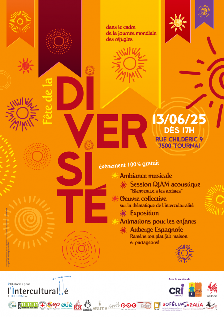 La Fête de la diversité est organisée par une coordination engagée d’acteurs locaux, dont les équipes du centre Croix Rouge pour demandeurs d’asile de Tournai, Soralia, le CRI Wapi, Lire et Écrire.