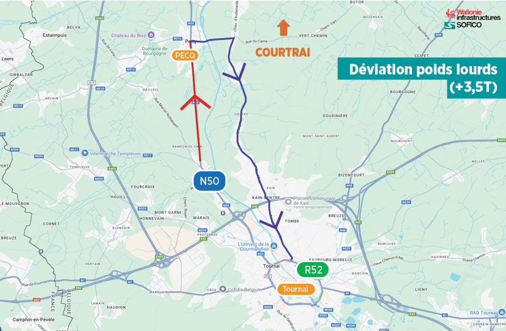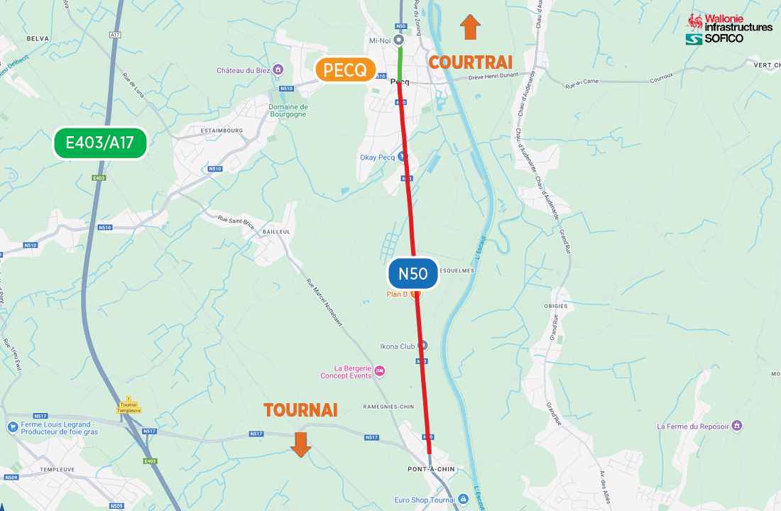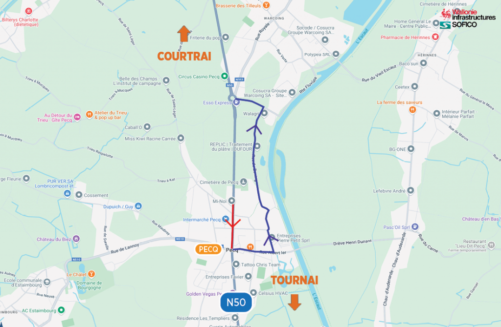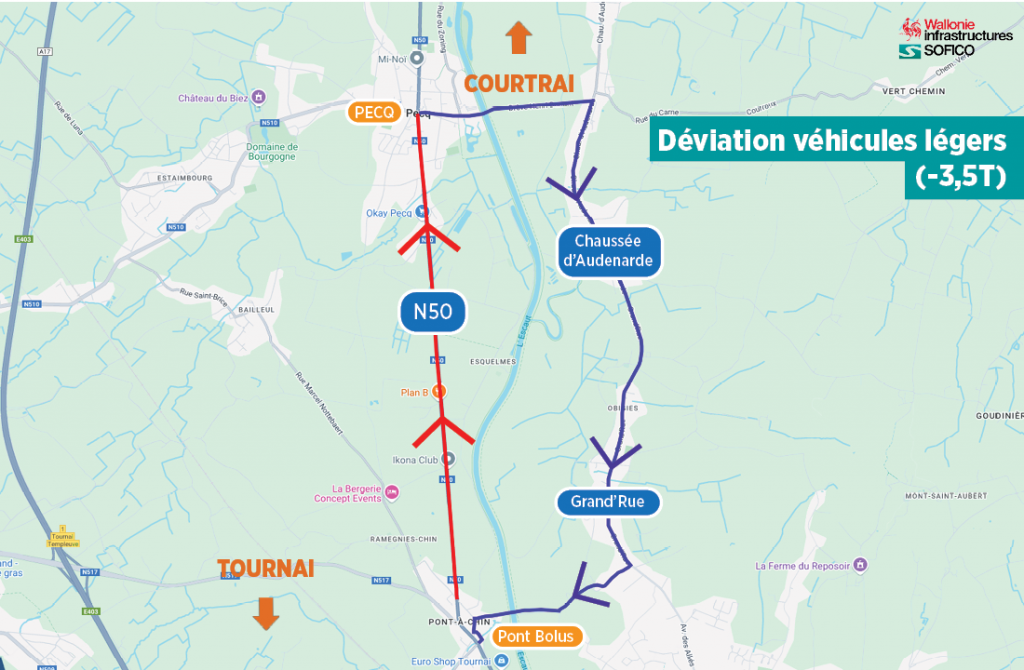 En complément, le week-end des 28 et 29 juin, la N50 sera également fermée dans l’autre sens, entre la place de Pecq et l’entrée de l’agglomération en provenance de Courtrai, en direction de Tournai.