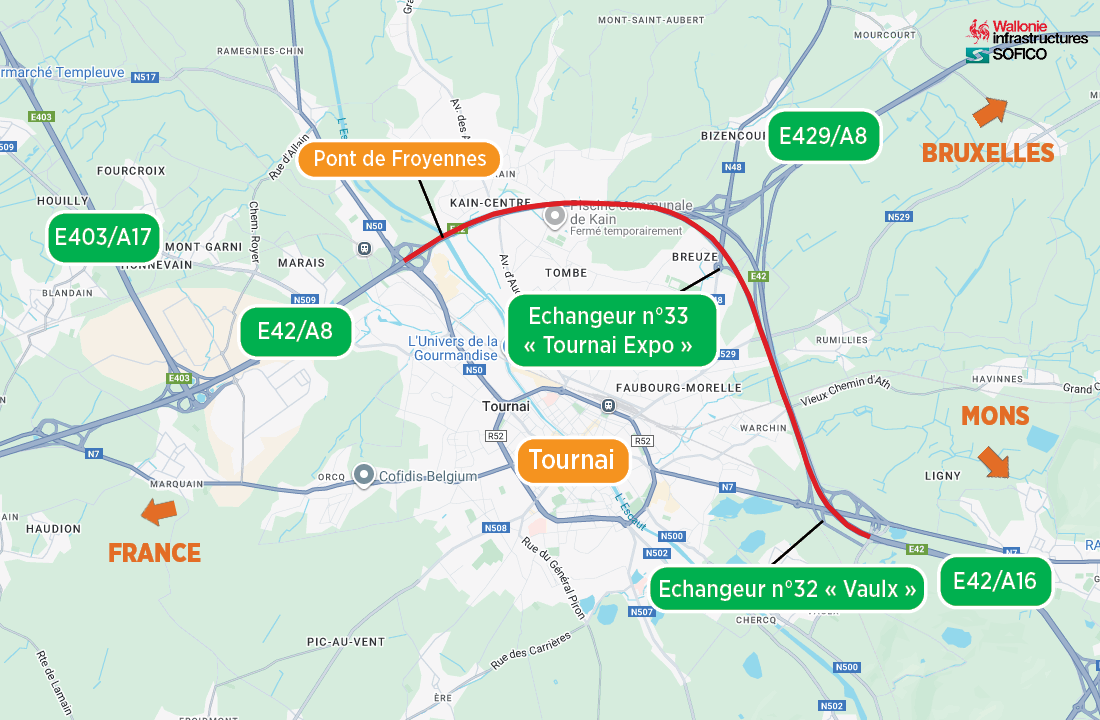 Dès la jonction E42/A8-E429/A8, la circulation s’effectuera sur deux bandes, avec une vitesse maximale limitée à 70 km/h, pour rejoindre le chantier du pont de Froyennes.