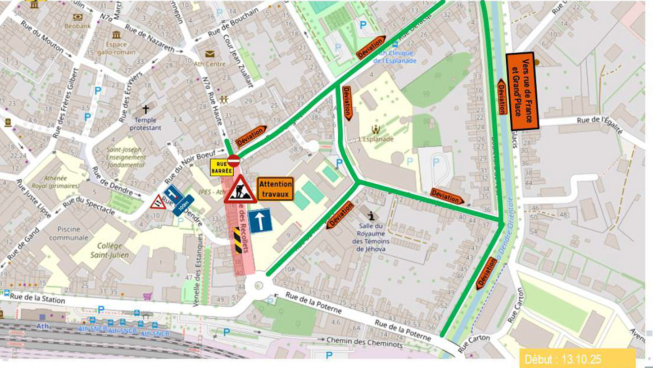 Le chantier reprendra en janvier 2026 pour les travaux d’égouttage avec IPALLE, avant de se clôturer avec le réaménagement de la voirie et des trottoirs pour la Ville d’Ath. Les dates exactes et les modalités de circulation seront communiquées ultérieurement.