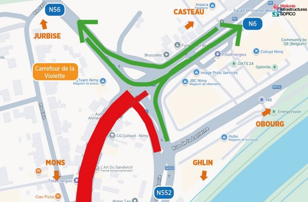 Durant la deuxième phase, la circulation sera également modifiée au carrefour de la Violette (N6, N56 et N552). Certains mouvements, comme les trajets directs ou les tourne-à-gauche, seront interdits.